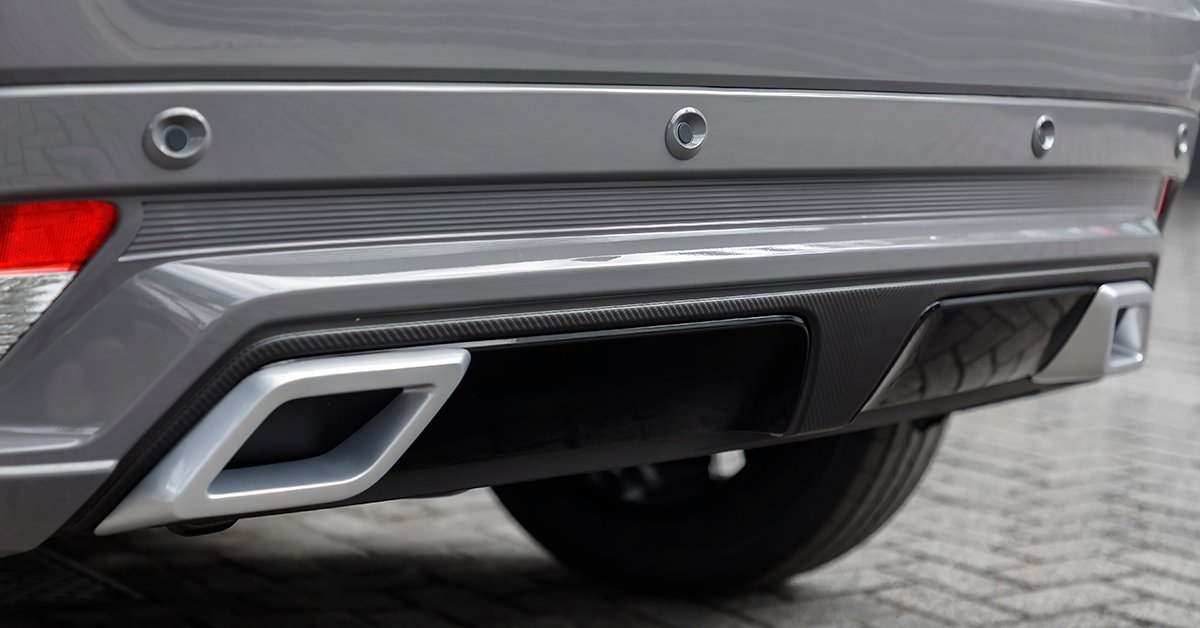 Atrás, destacam-se o aerofólio e o skid plate pintados em preto brilhante. Outro detalhe marcante são as lanternas com bordas escuras tipo fumê que percorrem toda a tampa, dividindo o vidro traseiro. A barra central traz acabamento tipo carbono, e o toque final fica com as peças em prata fosco que simulam ponteiras nas extremidades do para-choque.